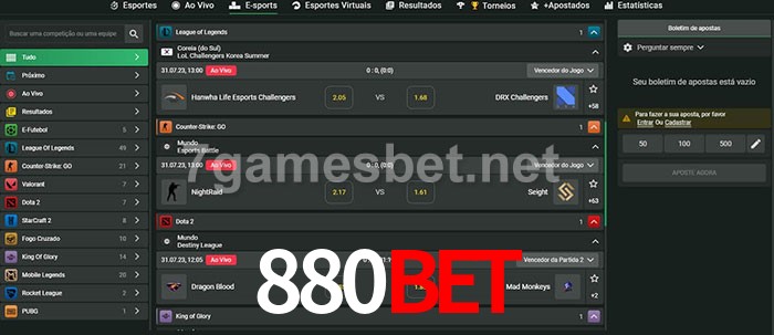 O 880Bet oferece uma grande seleção de opções de apostas em e-sports com probabilidades competitivas